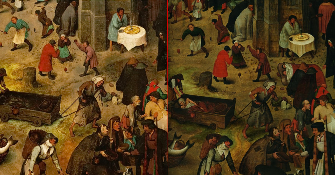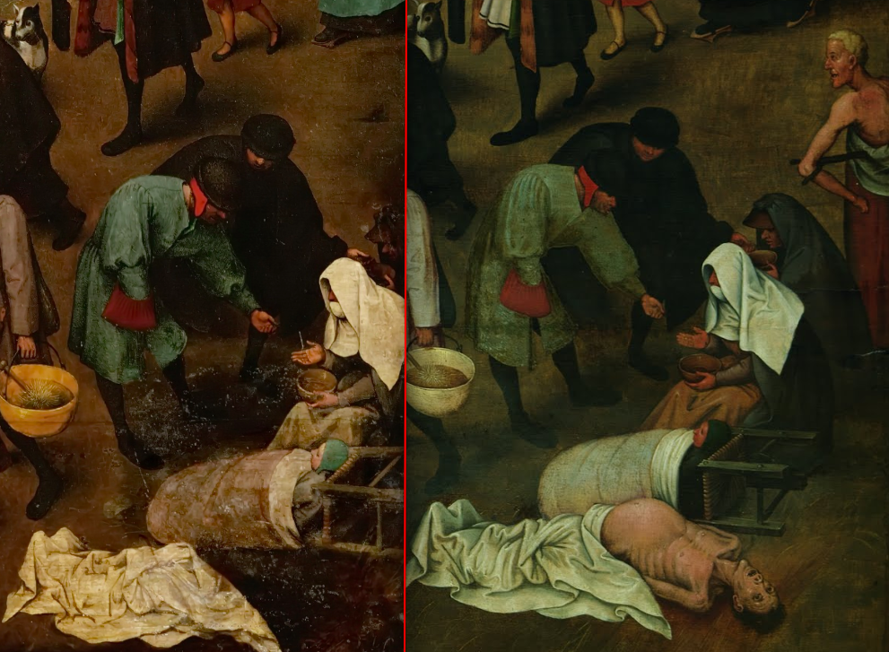 Zestawienie fragmentów "Walki Karnawału z Postem" Pietera Bruegela Starszego (w Wiedniu, fot. https://de.wikipedia.org/wiki/Der_Kampf_zwischen_Karneval_und_Fasten#/media/File:Pieter_Bruegel_d._%C3%84._066.jpg) i kopii Pietera Brueghela Młodszego (w Brukseli, fot. J. Geleyns / Royal Museums of Fine Arts of Belgium, Brussels / https://artsandculture.google.com/asset/the-fight-between-carnival-and-lent/ZwEty4gd9uLrUA). W kopii (po prawej) widoczne są zwłoki w dolnym rogu i postać żebraka przy krawędzi, które zostały zamalowane w oryginale (po lewej).