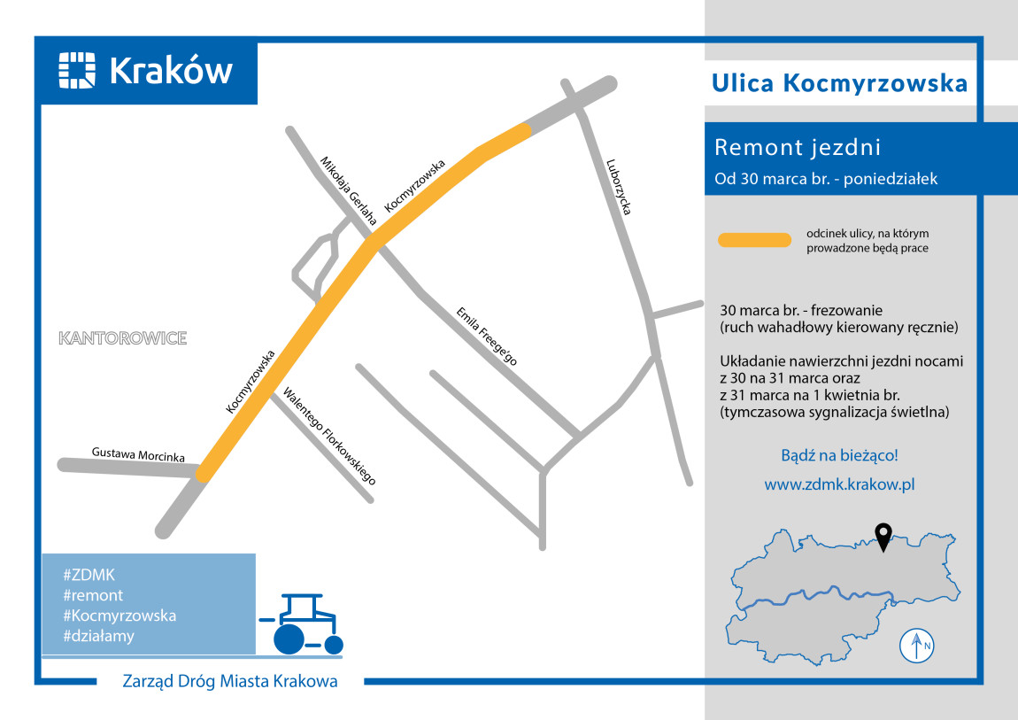 Nowy asfalt zostanie położony od skrzyżowania z ulicą Morcinka do granic miasta. W ciągu dnia zdzierana będzie stara nawierzchnia. Nową drogowcy będą kłaść w nocy. Ruch na ulicy Kocmyrzowskiej będzie odbywał się wahadłowo.