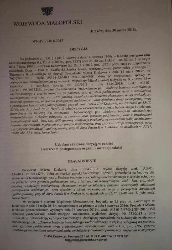 Od tej decyzji zostało wniesione przez dewelopera odwołanie do Wojewody Małopolskiego. W toku postępowania odwoławczego przedłożone zostały przez inwestora dokumenty świadczące o tym, że nie został zachowany termin dotyczący złożenia wniosku o wznowienie postępowania przez Wspólnotę Mieszkaniową z os. Kolorowego – pismo (wniosek) wpłynęło 23.05.2017 r. Jest to pismo z 8.04.2016 r. kierowane do Rady Dzielnicy Nowa Huta, przekazane do Rady Dzielnicy za pośrednictwem zarządcy ADREM. S.A.