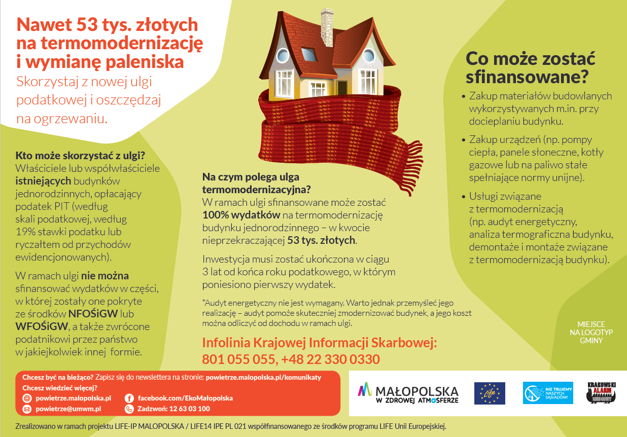 Ulga pozwala na odliczenie od dochodów wydatków związanych z realizacją przedsięwzięć termomodernizacyjnych, wymiany urządzeń grzewczych oraz instalacji odnawialnych źródeł energii w domach jednorodzinnych. Ile można odliczyć? W ramach ulgi termomodernizacyjnej można odliczyć 100% wydatków poniesionych w okresie realizacji przedsięwzięcia. Jednak kwota nie może być wyższa niż 53 000 zł, niezależnie od liczby posiadanych nieruchomości. Ulgę termomodernizacyjną można łączyć np. z dotacją z Programu Czyste Powietrze. Dowodem poniesionych wydatków jest faktura VAT. Więcej na https://powietrze.malopolska.pl/dofinansowanie/ulga-termomodernizacyjna/