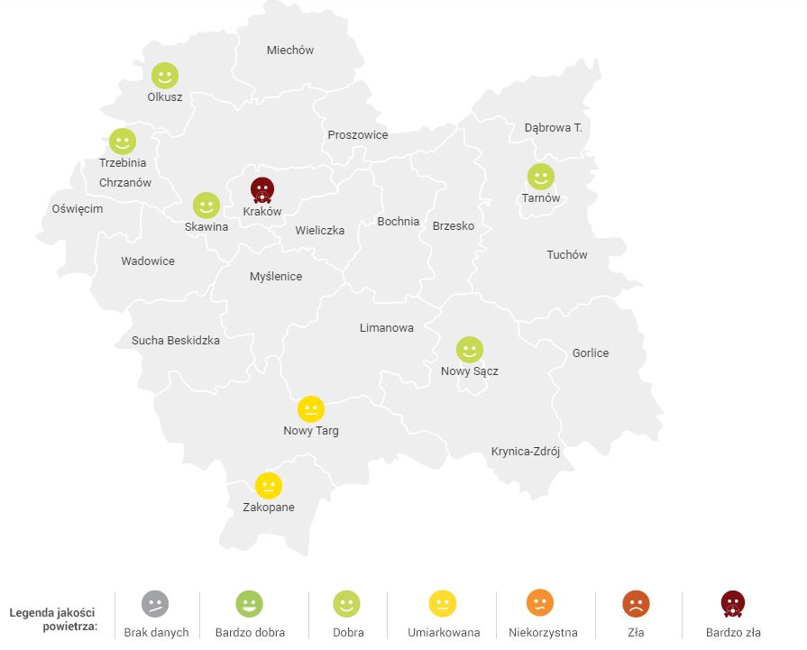 Najgorzej jest w Krakowie - mocno przekroczone są normy stężenia pyłu zawieszonego PM 2.5, a normy stężenia pyłu PM10 przekroczone są ponad trzykrotnie. Równie zły stan powietrza jest w Skawinie. Niewiele lepiej, przy ponad dwukrotnym przekroczeniu norm w Suchej Beskidzkiej, Nowym Sączu i Nowym Targu. W Zakopanem też o czystym powietrzu mówić nie można, co więcej poziom zanieczyszczeń pod Tatrami ma tendencję wzrostową. Swobodnie oddychać można tylko w Tarnowie, Trzebini i Olkuszu.