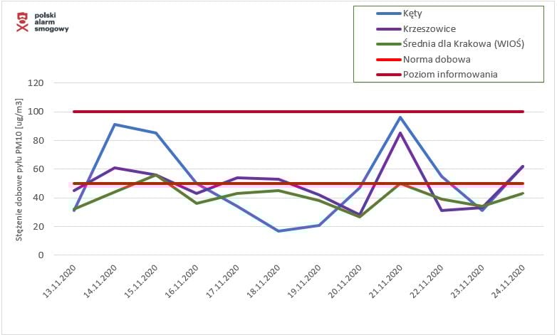 W pierwszym etapie akcji pyłomierze zostały umieszczone w gminach Kęty i Krzeszowice. Na 12 dni pomiarów dobowa norma dla stężenia pyłu PM10 (50 µg /m3) została przekroczona przez 5 dni w Kętach, a przez 6 dni w Krzeszowicach. W całym roku takich przekroczeń może być zaledwie 35. Najwyższe godzinne stężenia w Kętach i Krzeszowicach przekraczały nawet 200 µg/m3. W dniu zakończenia pomiarów stężenia godzinowe w Kętach sięgały niemal 300 µg/m3. Dla porównania, w tym samym czasie średnie stężenie ze stacji w Krakowie przekroczyło normę dobową jedynie w ciągu jednego dnia. Warto zaznaczyć, że stężenia badanych zanieczyszczeń zarówno w Kętach jak i w Krzeszowicach były wyższe niż stężenia odnotowane w Krakowie. Średnia dla całych pomiarów w Kętach wyniosła: 52 µg/m3, w Krzeszowicach: 49 µg m3, a w Krakowie 41 µg m3.