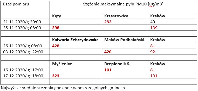 Najwyższe godzinne stężenie w Makowie Podhalańskim wyniosło 420 µg/m3, a w Kalwarii 428 µg/m3. Najwyższe godzinne stężenie w Myślenicach wyniosło 323 µg/m3, a w Rzepienniku Suchym 101 µg/m3.W dniu zakończenia pomiarów stężenia godzinowe w Kętach sięgały niemal 300 µg/m3, natomiast w Krzeszowicach najwyższe średnie stężenie godzinne wyniosło 232 µg/m3.