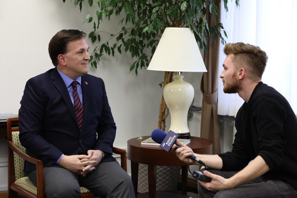 Patrick Slovinski w rozmowie z reporterem Radia Kraków. Fot. Konsulat USA w Krakowie