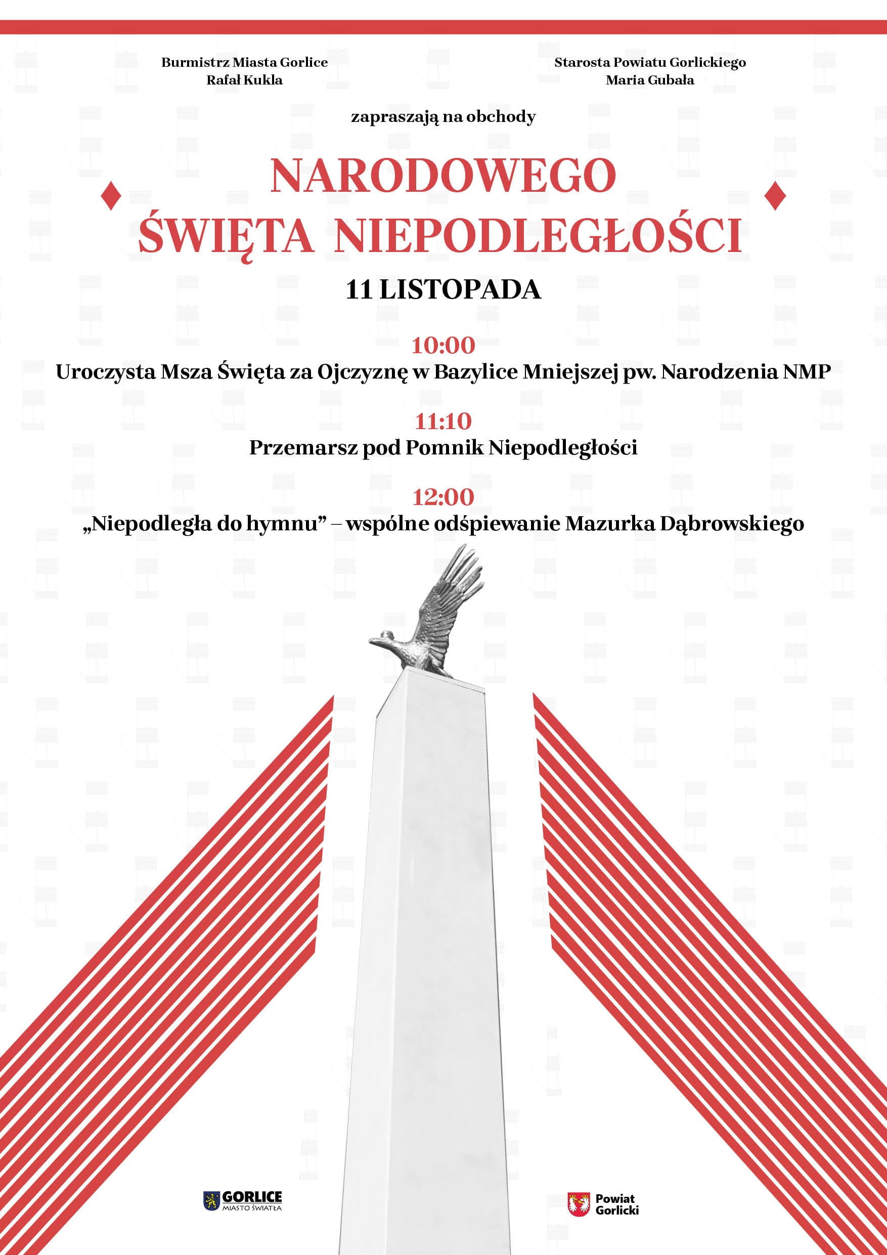 Obchody rozpoczną się o godzinie 10:00 uroczystą Mszą Świętą za Ojczyznę w Bazylice Mniejszej pw. Narodzenia NMP w Gorlicach.