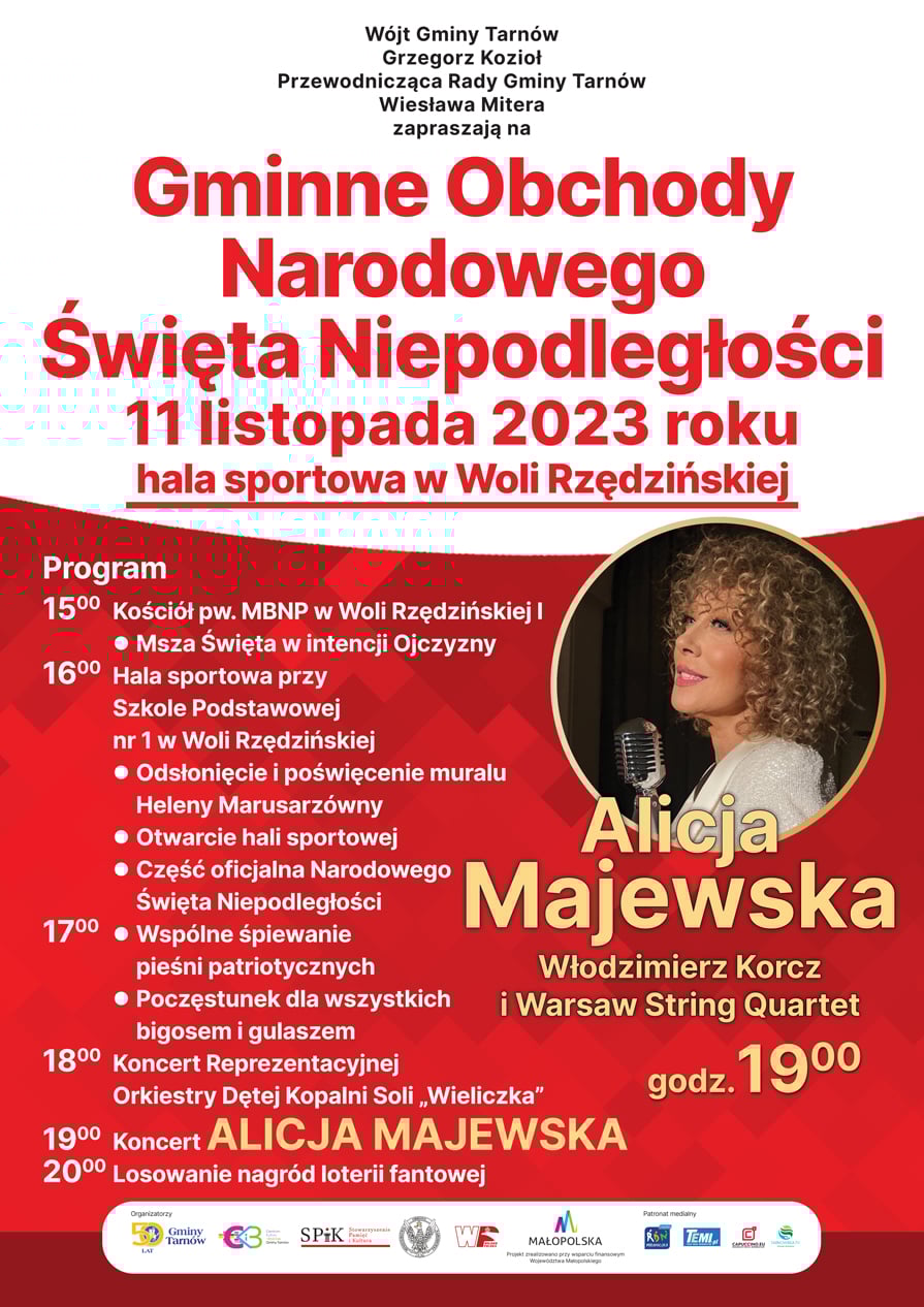 Gmina Tarnów zaprasza na obchody Narodowego Święta Niepodległości, które odbędą się 11 listopada w Woli Rzędzińskiej. Na uczestników czeka wiele atrakcji, w tym wspólny śpiew pieśni patriotycznych, koncert Orkiestry Dętej Kopalni Soli „Wieliczka”, a na zakończenie wyjątkowy koncert legendy polskiej sceny muzycznej, Alicji Majewskiej.
