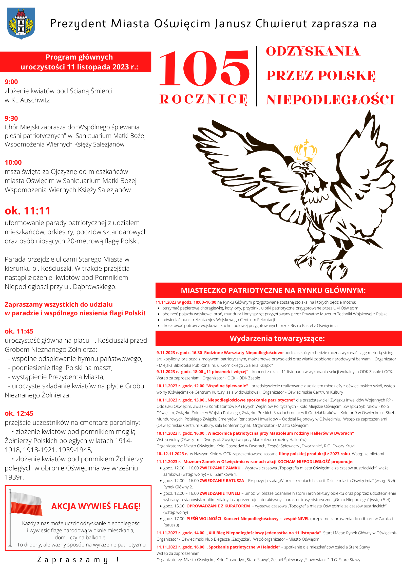 Prezydent Oświęcimia Janusz Chwierut zaprasza wszystkich mieszkańców, gości oraz delegacje oficjalne na uroczyste obchody 105. rocznicy odzyskania przez Polskę Niepodległości.