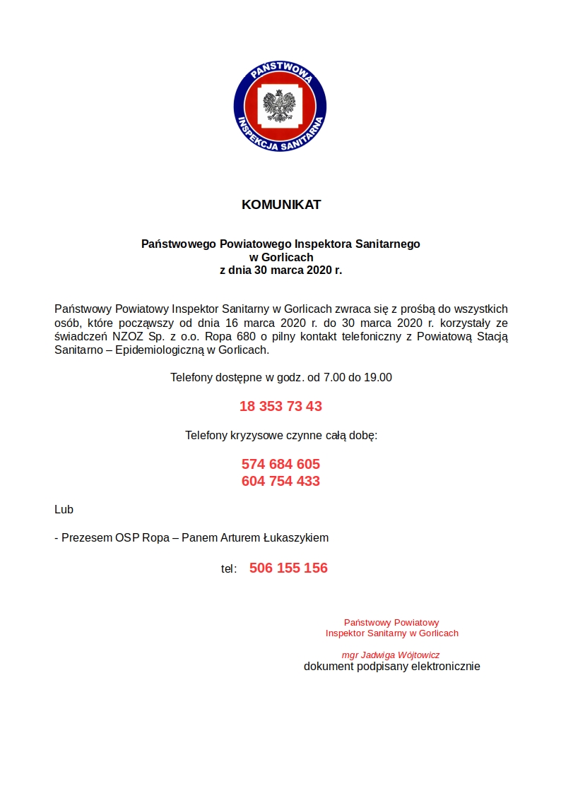 Gorlicki sanepid pilnie poszukuje osób, które w dniach od 16 do 30 marca korzystały ze świadczeń Niepublicznego Zakładu Opieki Zdrowotnej w Ropie. Osoby te proszone są o pilny kontakt z Państwową Stacją Sanitarno-Epidemiologiczną w Gorlicach. U jednego z lekarzy przeprowadzono test na obecność koronawirusa. Wynik był pozytywny.