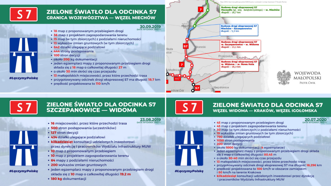 W minionym roku Wojewoda Małopolski wydał decyzje o zezwoleniu na realizację inwestycji drogowych dla dwóch odcinków w ramach budowy drogi ekspresowej S7 Warszawa – Kraków: