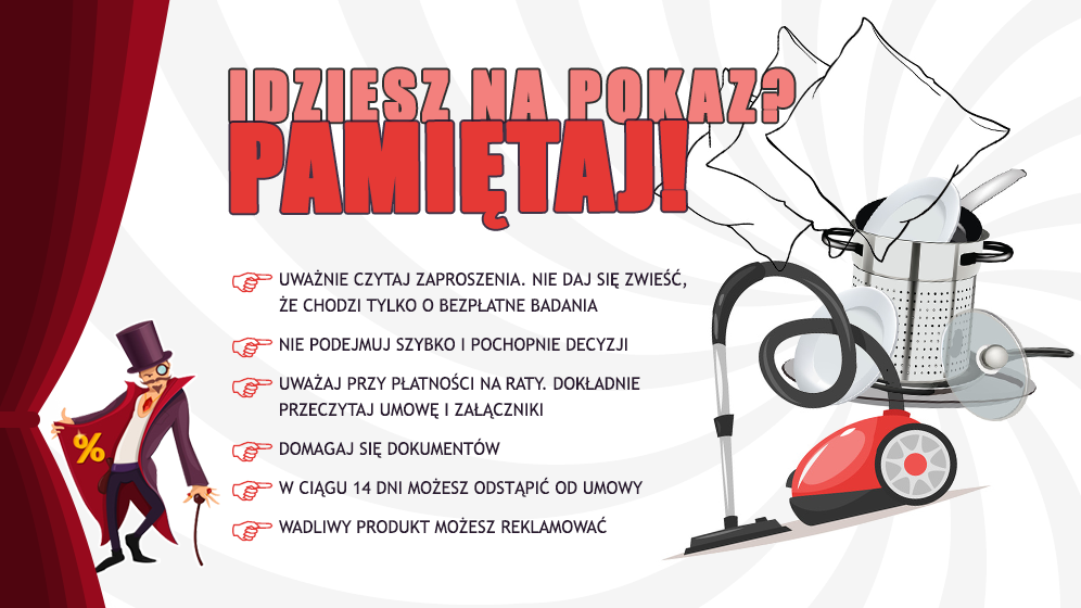 Urzędnicy ostrzegają też przed oferowanymi na pokazach pakietami usług zdrowotnych. Jak podkreślają, luka w prawie konsumenckim sprawia, że z tego typu umowy zdecydowanie ciężej jest się wycofać. Dlatego też idąc na pokaz, warto dokładnie sprawdzić czy oferowane produkty są rzeczywiście darmowe, zastanowić się czy potrzebujemy nowych garnków, masażera i czy kredyt na leczniczą pościel nie zrujnuje naszego portfela.