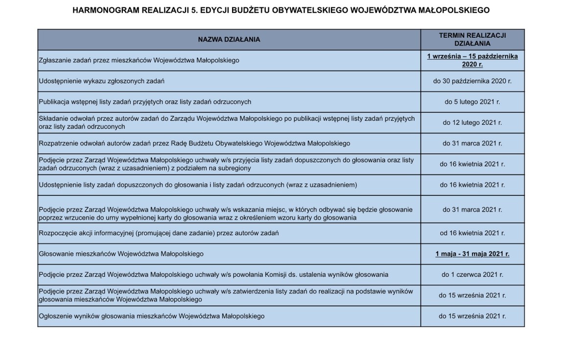 Do 30 kwietnia można składać pomysły do krakowskiego budżetu obywatelskiego, ale głosować na nie będzie można dopiero jesienią. Opóźnić termin budżetu obywatelskiego dla całego wojewdztwa małopolskiego zdecydował się też zarząd województwa. "Przede wszystkim przesunięto zgłaszanie zadań przez mieszkańców. To pierwotnie miało się zacząć 1 kwietnia. Potem na początku maja. Ostatecznie zarząd zdecydował, że mieszkańcy będą mogli zgłaszać swoje projekty między 1 września i 15 października. Równocześnie głosowanie mieszkańcow zostało przesunięte na przyszły rok. Będzie to między 1 i 31 maja" - wyjaśnia Michał Drewnicki, rzecznik prasowy urzędu marszałkowskiego, który przyznaje, że rzesza Małopolan głosowała tradycyjnie w poprzednich edycjach budżetu, wrzucając karty do głosowania do urn. W obecnej sytuacji nie dałoby się tego bezpiecznie przeprowadzić.