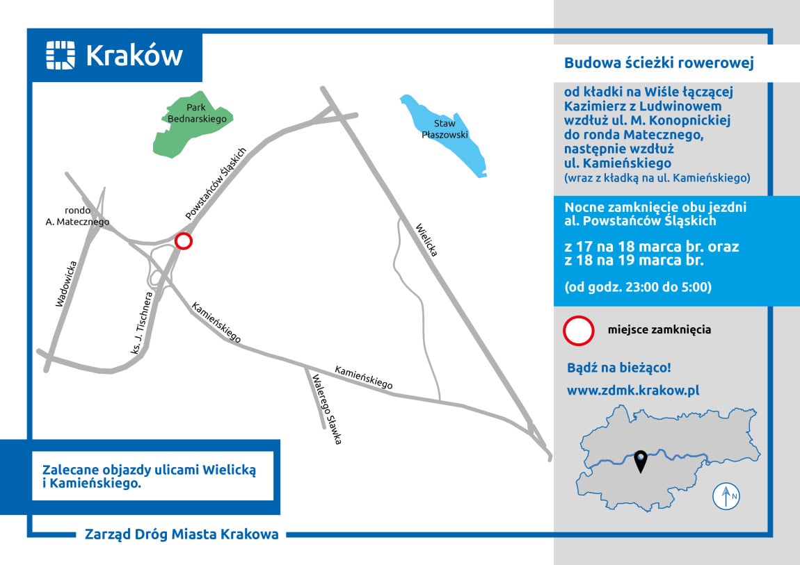 W związku z montażem al. Powstańców Śląskich zostanie całkowicie zamknięta dla ruchu w obu kierunkach. Kierowcy jadący w stronę Nowej Huty kierowani będą objazdem, ulicami Kamieńskiego oraz Wielicką, z kolei w kierunku A4 zostaną skierowani do Ronda Matecznego, by po zawróceniu wrócili na al. Powstańców Śląskich.