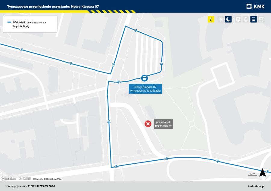 W związku z pracami przystanek autobusowy „Nowy Kleparz” 07 dla linii nr 904 w kierunku Prądnika Białego zostanie przeniesiony do tymczasowej lokalizacji na pętli „Nowy Kleparz” (na wysokości przystanku końcowego dla linii nr 189). Linia nr 904 w kierunku Wieliczki oraz linie dzienne będą funkcjonować bez zmian.