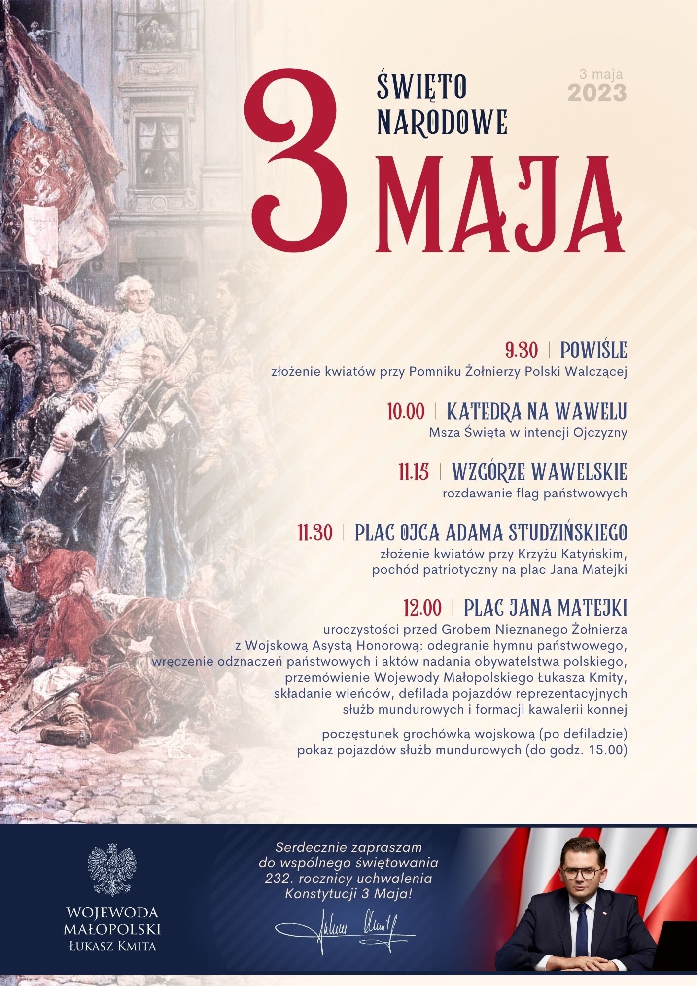 Późnym popołudniem, we wtorek 3 maja 1791 r. z Zamku Królewskiego w Warszawie wyruszył wyjątkowy pochód. Ulicą Świętojańską do katedry św. Jana podążał tłum osób. Całemu wydarzeniu towarzyszył nastrój radości. Oto bowiem uchwalona została pierwsza w Europie i druga na świece Konstytucja. Ustawa zasadnicza, która miała unowocześnić i umocnić Najjaśniejszą Rzeczpospolitą. Do dziś stanowi ona fundament pewnych wartości i jest powodem do dumy. Dlatego zachęcam, aby w rocznicę jej uchwalenia, uczestniczyć w przygotowanych z tej okazji krakowskich obchodach. Niech to będzie czas celebrowany wspólnie z najbliższymi w duchu patriotyzmu i poszanowania tradycji