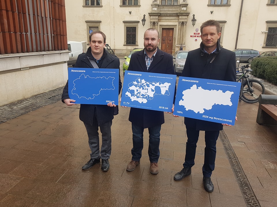 Tymczasem przed południem przed krakowskim magistratem działacze Nowoczesnej zgłosili własny pomysł pokrycia całego miasta planami zagospodarowania przestrzennego. Przypomnijmy, ten dokument określa jak duże i jakiej wysokości budynki mogą powstawać, tak aby nie działo się to w sposób niekontrolowany. Jak podkreśla Michał Starobrat - sekretarz małopolskich struktur partii - przez ostatnich 15 lat udało się objąć planami zaledwie 52 procent powierzchni Krakowa, teraz - jego zdaniem - należy znacznie przyspieszyć.