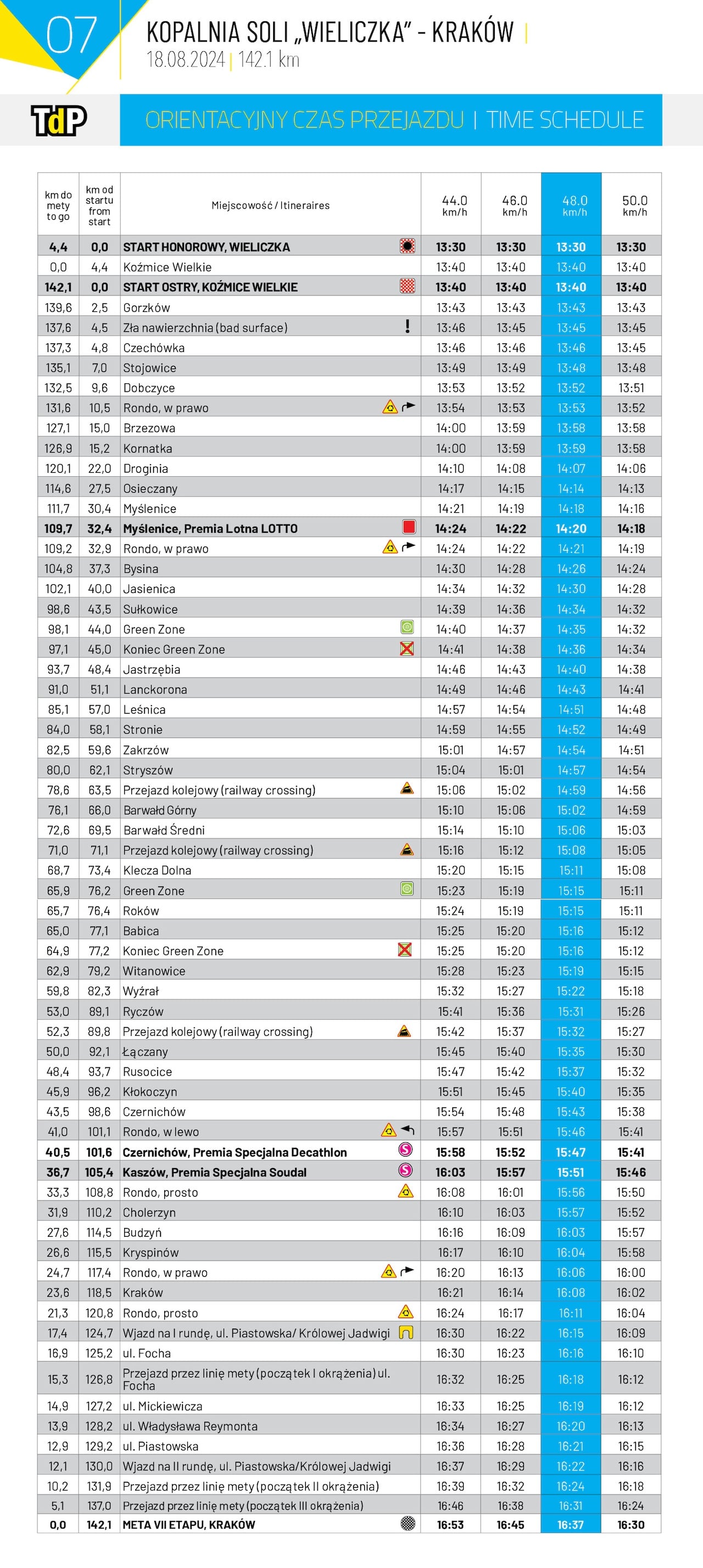 Ok. godz. 16.00 nastąpi wjazd kolarzy do Krakowa od strony Kryspinowa drogą wojewódzką nr 774. Następnie peleton pojedzie ulicami: Olszanicką (całą szerokością jezdni), Chełmską, Junacką, Królowej Jadwigi do skrzyżowania z Piastowską, na których to ulicach pomiędzy godz. 15.30 a godz. 16.30 zostaną wprowadzone chwilowe przerwy w ruchu. Dalej kolarze pojadą ul. Królowej Jadwigi, al. Focha, a po przejechaniu trzech pętli ulicami: al. Mickiewicza, Reymonta, Piastowską, Królowej Jadwigi i al. Focha, około godz. 16.30 przewiduje się przyjazd kolarzy na metę (al. Focha), a następnie dekorację zawodników.