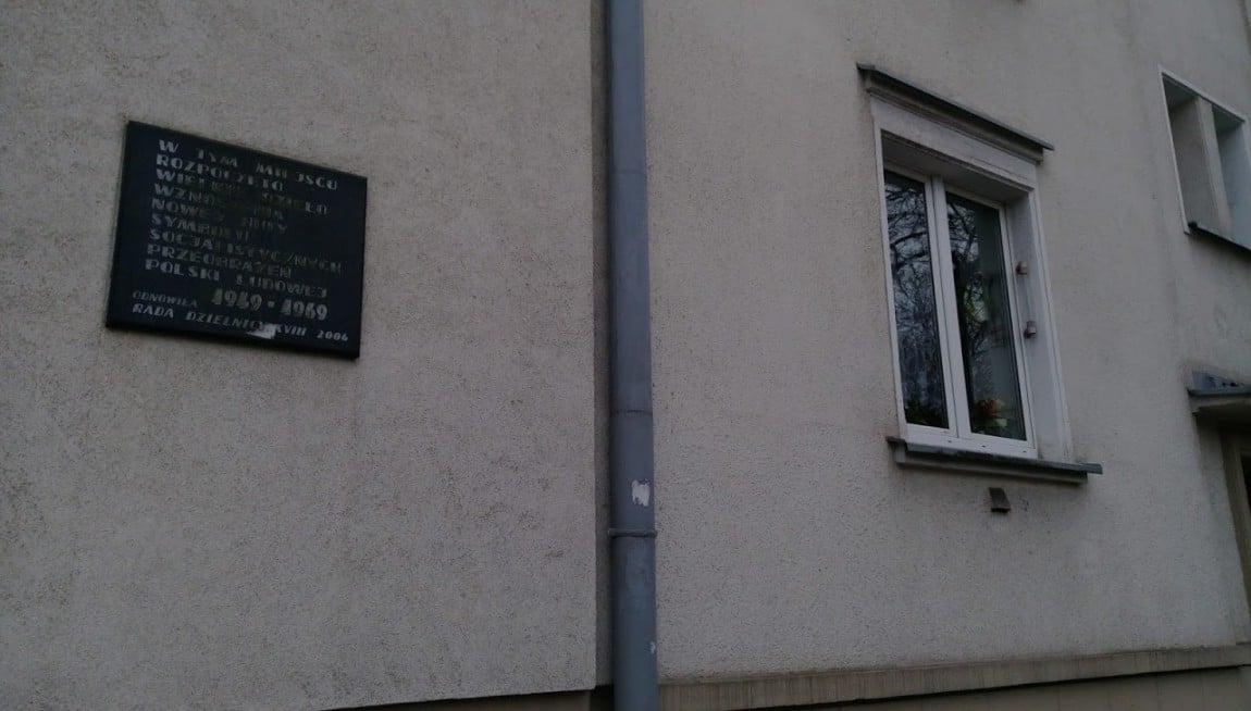 Tuż obok placu Pocztowego na jednym z budynków wisi tablica wskazująca miejsce, w którym rozpoczęło się "dzieło wznoszenia Nowej Huty". Fot. EW
