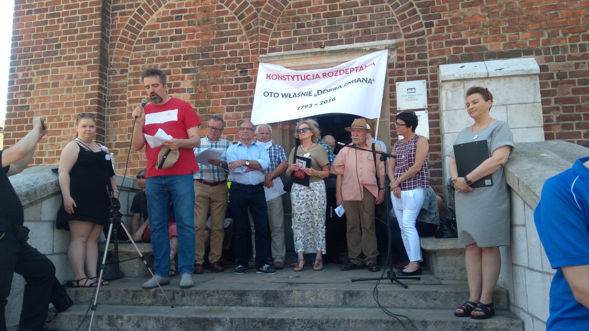 "Trybunał nie stoi już na straży konstytucyjnych praw obywateli - wolności, demokracji, stał się instrumentem niszczenia prawa w Polsce. Ma pozwolić Andrzejowi Dudzie na składanie swoich podpisów bez lęku, w pełnym komforcie bezkarności" – mówił ze sceny przed ratuszem wiceprzewodniczący małopolskiego KOD, prawnik Fryderyk Zoll, syn byłego prezesa TK prof. Andrzeja Zolla.