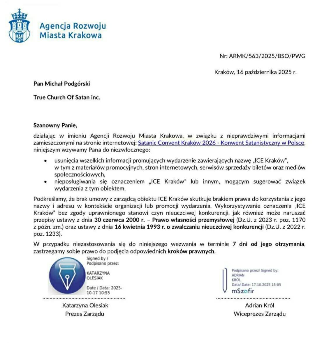 W połowie października prezes Agencji Rozwoju Miasta Krakowa Katarzyna Olesiak skierowała do organizatora konwentu satanistów - do podmiotu „True Church of Satan inc.” - oficjalne wezwanie przedprocesowe. W piśmie nakazano natychmiastowo usunąć nazwę „ICE Kraków” z materiałów promocyjnych. Powodem miało być naruszenie przepisów o zwalczaniu nieuczciwej konkurencji.