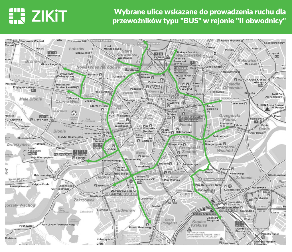 (...)W kwestii m.in. „blokowania” pojazdów Komunikacji Miejskiej w Krakowie (KMK) np. na przystankach wzdłuż ATW, podjęto decyzję, działając w interesie pasażerów KMK, aby ruch BUS „skanalizować” poprzez udostępnienie na niektórych ciągach jedynie przystanków przeznaczonych dla konkretnych kierunków. Przewoźnicy jadący z centrum w kierunku Borku Fałęckiego przez ul. Zakopiańską będą mogli się zatrzymywać na Alejach jedynie na przystanku „Jubilat”, a ci kierujący się w stronę ul. Wielickiej przystanek „AGH”.