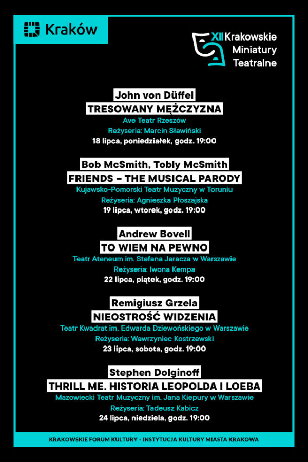 Organizatorzy zadbali o to, by w ciągu festiwalowego tygodnia było komediowo, musicalowo, poważnie i z dreszczykiem emocji. Do udziału w projekcie Krakowskie Forum Kultury zaprosiło teatry z Rzeszowa, Torunia i Warszawy. Wśród aktorów, którzy swym talentem ubogacą tegoroczną edycję KMT, znaleźli się między innymi Agata Kulesza, Przemysław Bluszcz i Ewa Ziętek, która w trakcie festiwalu będzie obchodziła jubileusz 50-lecia pracy artystycznej.