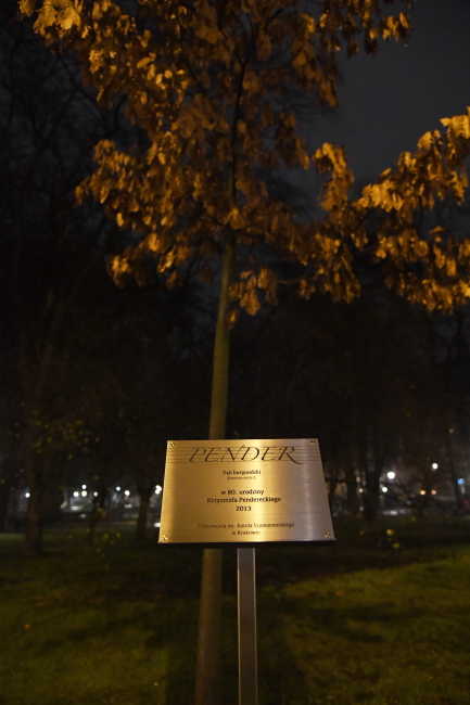 W sobotę wieczorem, tuż przed koncertem w Filharmonii Krakowskiej dedykowanym Krzysztofowi Pendereckiemu z okazji jubileuszu 85-lecia jego urodzin, odbyła się uroczystość odsłonięcia tablicy pod dębem burgundzkim, zasadzonym przez kompozytora na Plantach w 2013 roku. Tablicę zaprojektowaną przez prof. Jana Tutaja z krakowskiej Akademii Sztuk Pięknych odsłonił sam maestro.