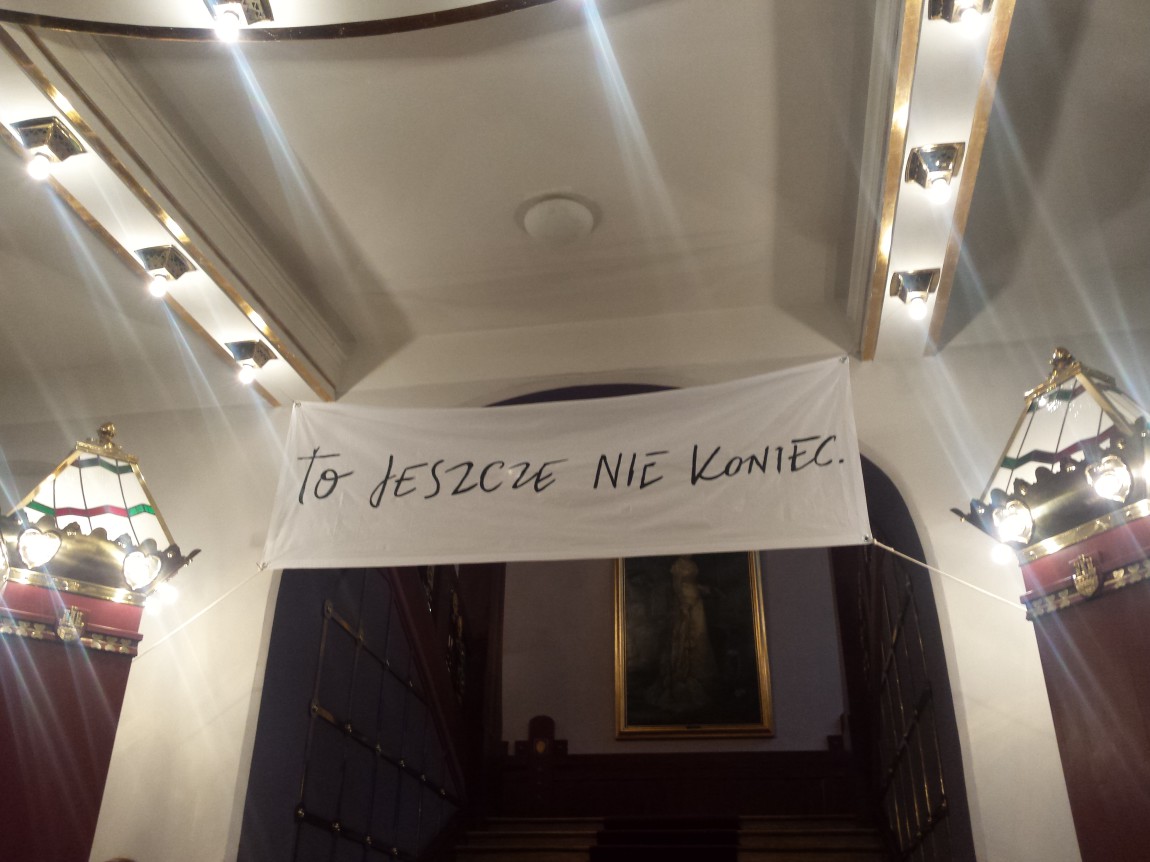 Po ogłoszeniu rekomendacji przez komisję konkursową, wewnątrz teatru pracownicy zawiesili baner z napisem: „To jeszcze nie koniec”. Klata zarządził wywieszenie czarnej flagi na budynku teatru od strony pl. Szczepańskiego.