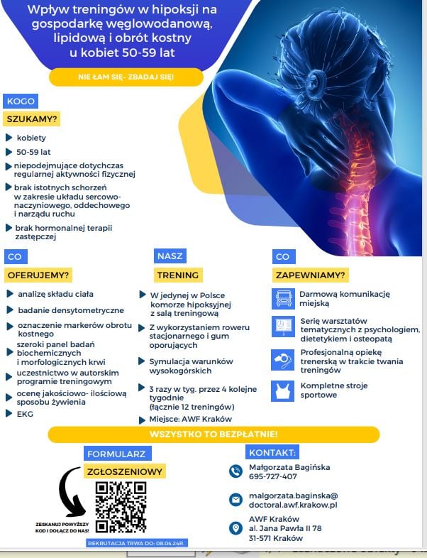 Celem badań jest zbadanie wpływu ćwiczeń i przebywania w warunkach wysokogórskich na gospodarkę węglowodanową, lipidową i obrót kostny u kobiet 50-59 lat.