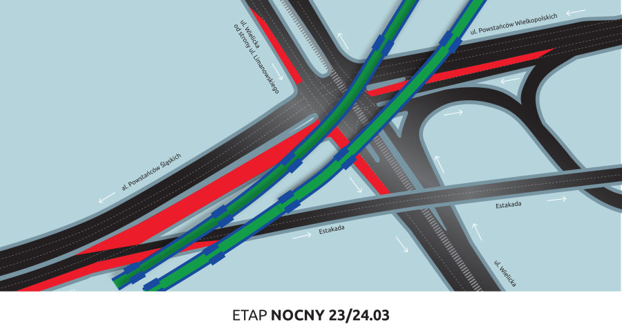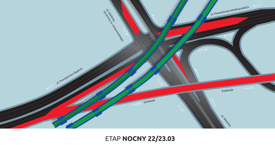 - zamknięcie dla ruchu kołowego estakady Obrońców Lwowa w godzinach 22:00 – 04:00