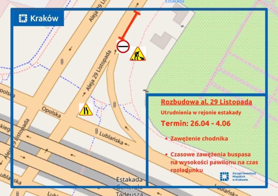 Z kolei na alei 29 listopada kolejne utrudnienie dla pieszych. Robotnicy zajmą fragment chodnika w pobliżu Opolskiej Estakady.