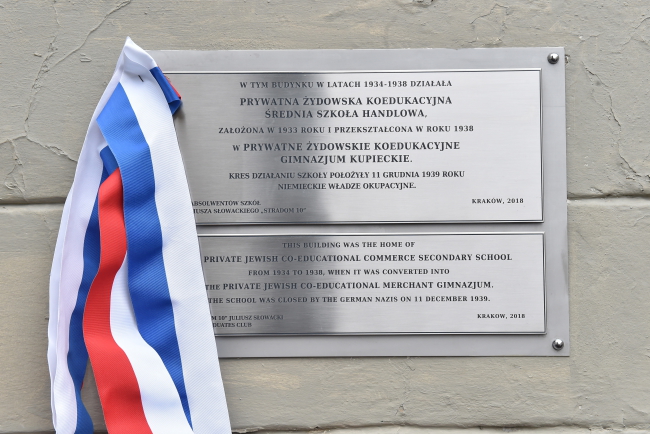"W tym budynku w latach 1934–1939 działała Prywatna Żydowska Koedukacyjna Średnia Szkoła Handlowa. Założona w 1933 roku i przekształcona w roku 1938 w Prywatne Żydowskie Koedukacyjne Gimnazjum Kupieckie. Kres działania szkoły położyły 11 grudnia 1939 roku niemieckie władze okupacyjne" – napisano na tablicy, ufundowanej przez Koło Absolwentów Szkół im. J. Słowackiego Stradom 10.