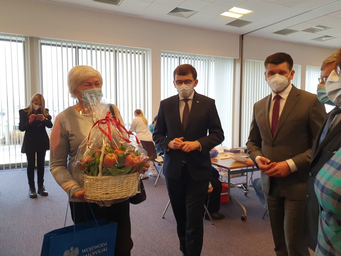 "Cieszę się, że pani Maria, która została losowo wybrana jako pięćdziesięciotysięczna osoba, szczepi się już drugą dawką. To pokazuje, że system jest sprawny i skuteczny. Jedna szósta wszystkich szczepień w Krakowie odbywa się w tym punkcie, to pokazuje skalę i rozmach infrastrukturalny, bo przecież trzeba to wszystko logistycznie przygotować" - mówił wojewoda małopolski Łukasz Kmita.
