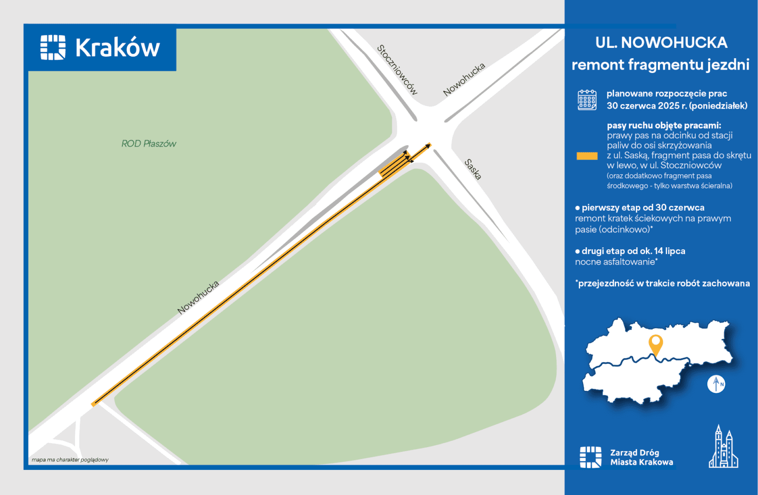 - od 30 czerwca – odcinkowe zajęcie prawego pasa jezdni ul. Nowohuckiej – na fragmencie od stacji paliw do skrzyżowania z ul. Saską (kierunek Nowa Huta).