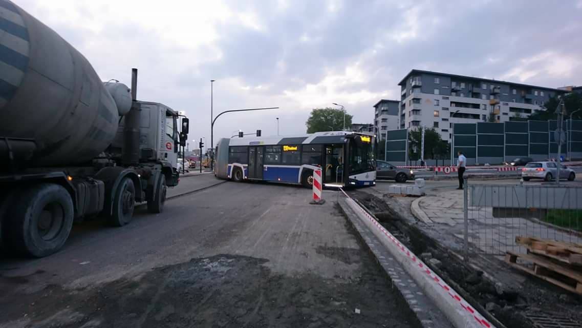 Przy budowie dojazdu do galerii handlowej zaklinował się autobus komunikacji miejskiej