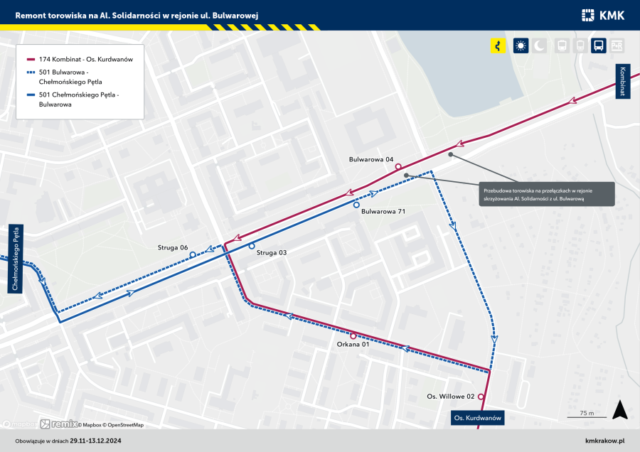 - nr 174 – w kierunku pętli „Os. Kurdwanów” będzie kursować na trasie: „Kombinat” – ... – przystanek „Łempickiego” 72, al. Solidarności, ul. Orkana, ul. Bulwarowa, przystanek „Os. Willowe” 02 – ... – „Os. Kurdwanów”. Trasa w kierunku pętli „Kombinat” pozostanie bez zmian.