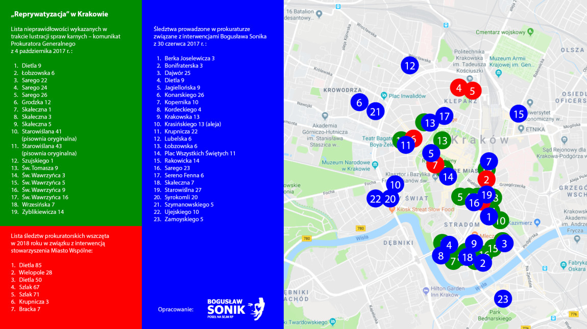 "Ulice: Konarskiego, Kopernika, Krupnicza, Łobzowska, Sarego, Rakowska, Serena Fenna, Skałeczna. Zabytkowe kamienice. Większość zarzutów dotyczy posługiwania się fałszywymi dokumentami do przejmowania kamienic, nagminne było używanie kopii dokumentów do podejmowania decyzji przez sąd" - mówi Radiu Kraków Bogusław Sonik.