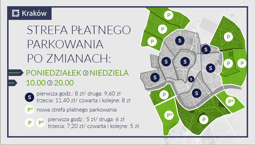 Zgodnie z nową propozycją, dotychczasowa strefa miałaby zostać podzielona na dwa obszary. Na terenie ścisłego centrum, Zwierzyńca i części Śródmieścia pierwsza godzina parkowania miałaby kosztować 8 złotych. Kolejna - już 9.60 zł. W strefie położonej dalej od Starego Miasta godzinny postój miałby kosztować 5 złotych. Później opłata rosłaby do 6 i 7,20 zł za kolejną godzinę. WIĘCEJ