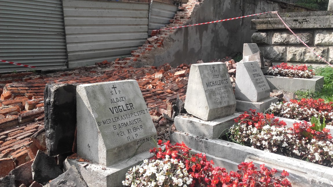 - Zawaliło się 20 metrów muru od strony ul. Kątowej – mówi Tomasz Piekarski, kierownik Cmentarza Rakowickiego - Uszkodzeniu uległa część znajdujących się tam nagrobków żołnierzy z I wojny światowej. Uszkodzone są tyły nagrobków z pierwszego rzędu. Skalę uszkodzeń poznamy po usunięciu zalegającego gruzu.