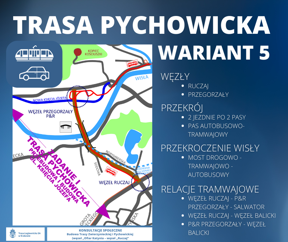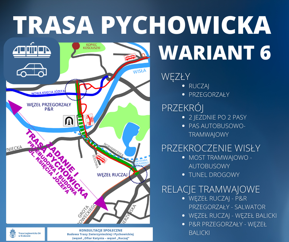 Mieszkańcy mają do wyboru dwa warianty Trasy Pychowickiej, z których jeden przewiduje poprowadzenie ruchu samochodowego tunelem pod Wisłą, a drugi mostem. Trasa Pychowicka będzie przedłużeniem Trasy Łagiewnickiej, która, jest coraz częściej wybierana przez kierowców