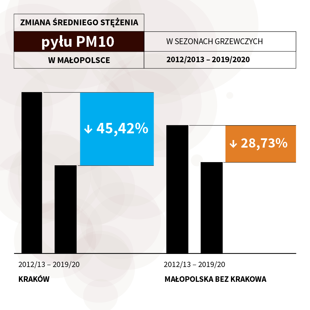 Jeśli chodzi o stężenia pyłu PM10 i PM2,5, to porównano dane z sezonów 2012/2013 i 2019-2020. Z analizy wynika, że zmiana średniego stężenia pyłu PM10 jest wyższa w Krakowie niż w całym województwie z wyłączeniem Krakowa. O ile spadek (liczony w sezonach grzewczych) w Krakowie wynosi 45,42 proc., tak w Małopolsce jest on mniejszy – 28,73 proc. Podobna tendencja występuje w przypadku pyłu PM2,5 – w Krakowie można zaobserwować zmianę na poziomie 43,76 proc., a w całym województwie z wyłączeniem Krakowa – 32,15 proc.