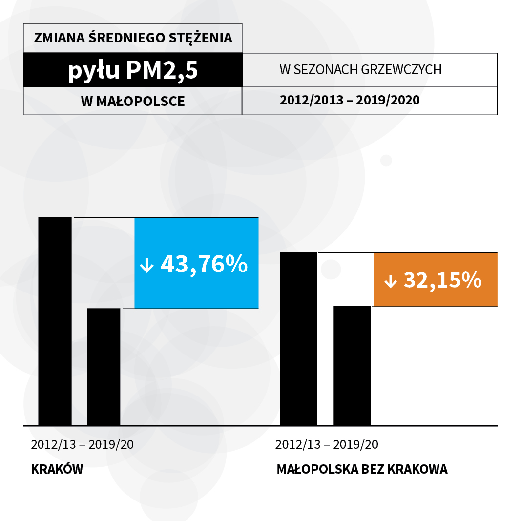 Infografika: Wyrażona w procentach zmiana średniego stężenia pyłu PM2,5 w Krakowie oraz w województwie w sezonach grzewczych 2012/13 -2019/20