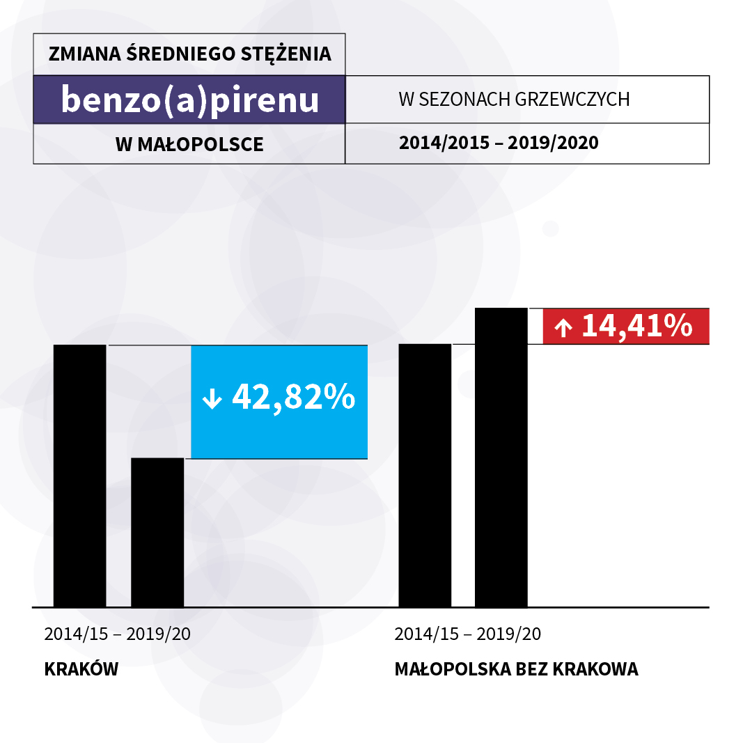 Pomiary benzo(a)pirenu pochodzą z sezonów 2014/2015 i 2019/2020 i tu sytuacja wygląda oryginalnie – w Krakowie spadek średniego stężenia wynosi 42,82 proc., podczas gdy w całym województwie na przestrzeni badanych lat stężenia benzo(a)pirenu wzrosły o 14,41 procent.