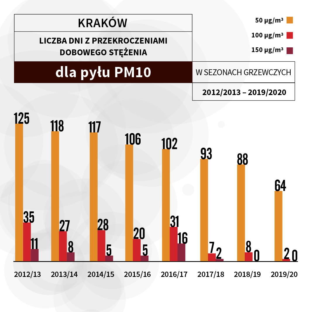 Porównując, liczba dni w sezonie grzewczym, kiedy stężenie dobowe PM10 przekracza poziom alarmowy (150 µg/m sześc.), to spadła ona z 11 (2012/2013) do zera (2019/2020). Równie widoczny spadek zaobserwowano w przypadku dni z przekroczeniem dobowej normy dla PM10 (50 µg/m sześc.) – ze 125 dni (2012/2013) do 64 (2019/2020).