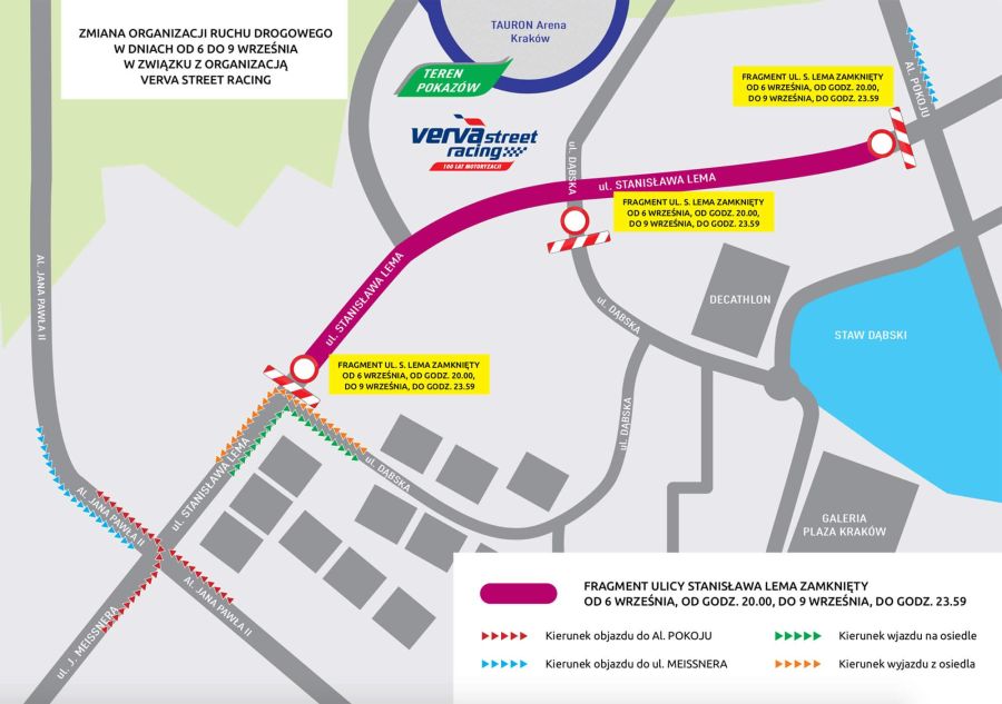 Fragment ulicy Stanisława Lema - od Al. Pokoju do ulicy Dąbskiej, zostanie zamknięty. Zamknięcie ulicy nastąpi 6 września o godz. 20:00 i potrwa do 9 września do godz. 23:59. W tym terminie prosimy o korzystanie z objazdów od ul. J. Meissnera, Al. Jana Pawła II oraz od Al. Pokoju.