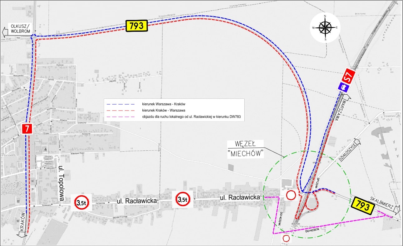 Zaznaczyła, że węzeł Miechów nie pozwala na bezpośredni zjazd na drogę krajową nr 7. Dlatego do momentu połączenia obu części S7 wprowadzimy na węźle Miechów i okolicznych drogach tymczasową organizację ruchu, która umożliwi przejazd pomiędzy S7 a DK7.