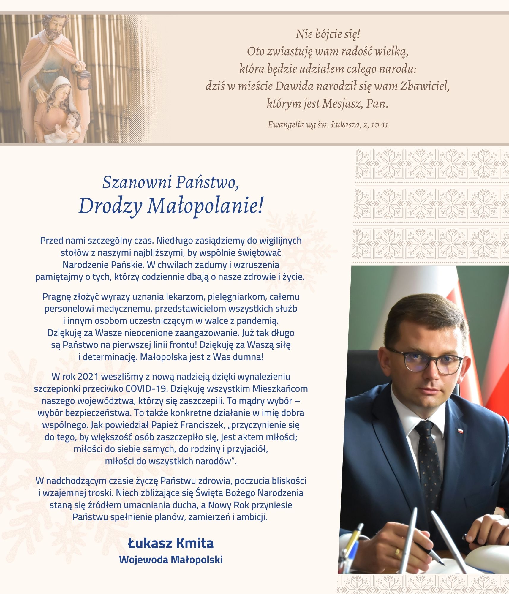 Wojewoda małopolski Łukasz Kmita życzył, żeby "rodzinne spotkania, pełne ciepła i życzliwości, umacniały łączącą nas więź, inspirowały do gestów dobroci, a betlejemska gwiazda towarzysząca narodzinom Zbawiciela oświetlała nasze życiowe drogi, którymi codziennie podążamy". "Na ten niezwykły świąteczny czas życzę zdrowia i sił, a nade wszystko obfitości łask i błogosławieństwa Bożej Dzieciny dla nas, naszych Bliskich i naszej umiłowanej Ojczyzny" – napisał wojewoda.