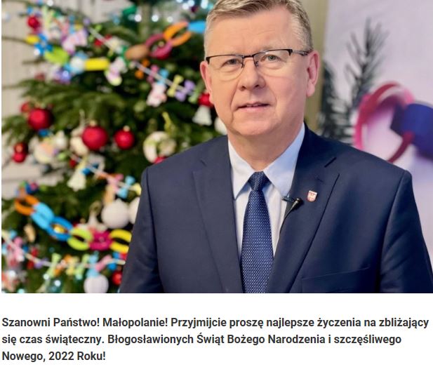 "Na te świąteczne dni życzę państwu zdrowia i nadziei płynącej z betlejemskiej stajenki. Choć na chwilę zapomnijmy o troskach dnia codziennego i bądźmy razem" – powiedział w nagraniu wideo marszałek Małopolski Witold Kozłowski. Podziękował także za aktywny udział w kampanii świątecznej województwa i wspólne stworzenie łańcucha dobra". "Drodzy Małopolanie. Niech nowy 2022 rok będzie dla nas wszystkich lepszy. Wypełniony wdzięcznością i serdecznym uśmiechem. Błogosławionych świąt Bożego Narodzenia i szczęśliwego nowego, 2022 roku" – zakończył marszałek.