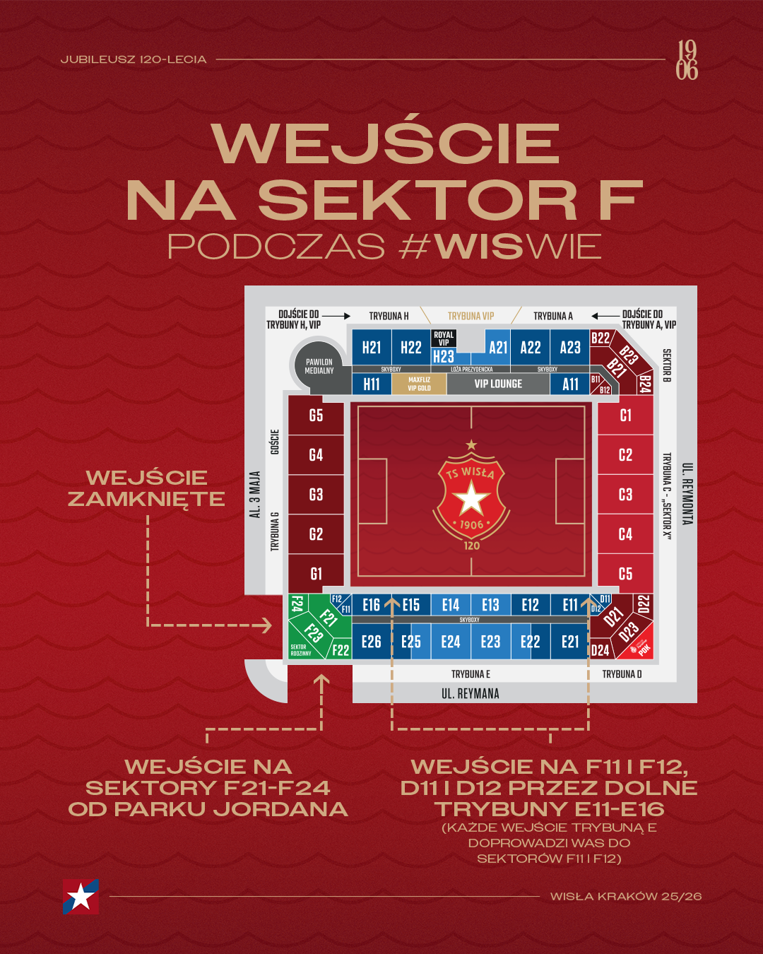 - Sektory F21–F24: Wejście odbywa się od strony Parku Jordana.