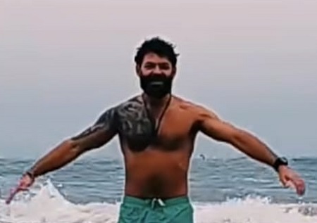 Tatuaże: na prawym ramieniu, przechodząca na klatkę piersiową - galaktyka, na prawej nodze -kobieta.