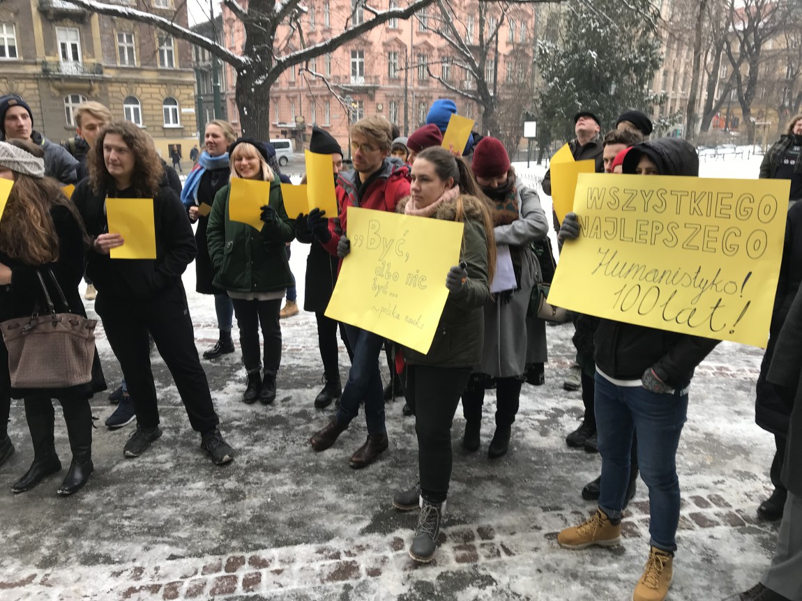 Studenci przyszli przed główny gmach Uniwersytetu Jagiellońskiego. Mieli plansze z hasłami "Tak dla polskich publikacji" i "Humanista został sam". Skandowali "żółta kartka dla Gowina" o mówili, że nie może być takiej sytuacji, że o świecie nauki nie decydują naukowcy, ale politycy. Podkreślali, że dostali przepisy, ale nie wiadomo jak je interpretować. Ten rok na uczelniach jest straszny, to zupełny chaos - powtarzali.